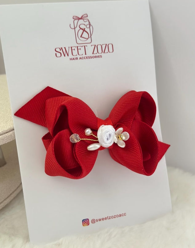 A charming handmade hair bow with a delicate flower, pearls, and crystal accents. Perfect for weddings, parties, or adding a touch of elegance to everyday looks.