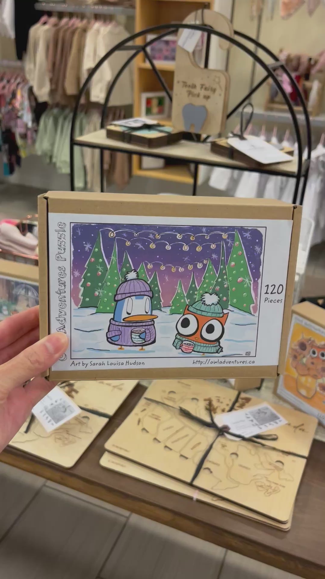 This is a 120 piece puzzle featuring Owl and Penguin with hot cocoa surrounded by Christmas trees and snowfall.