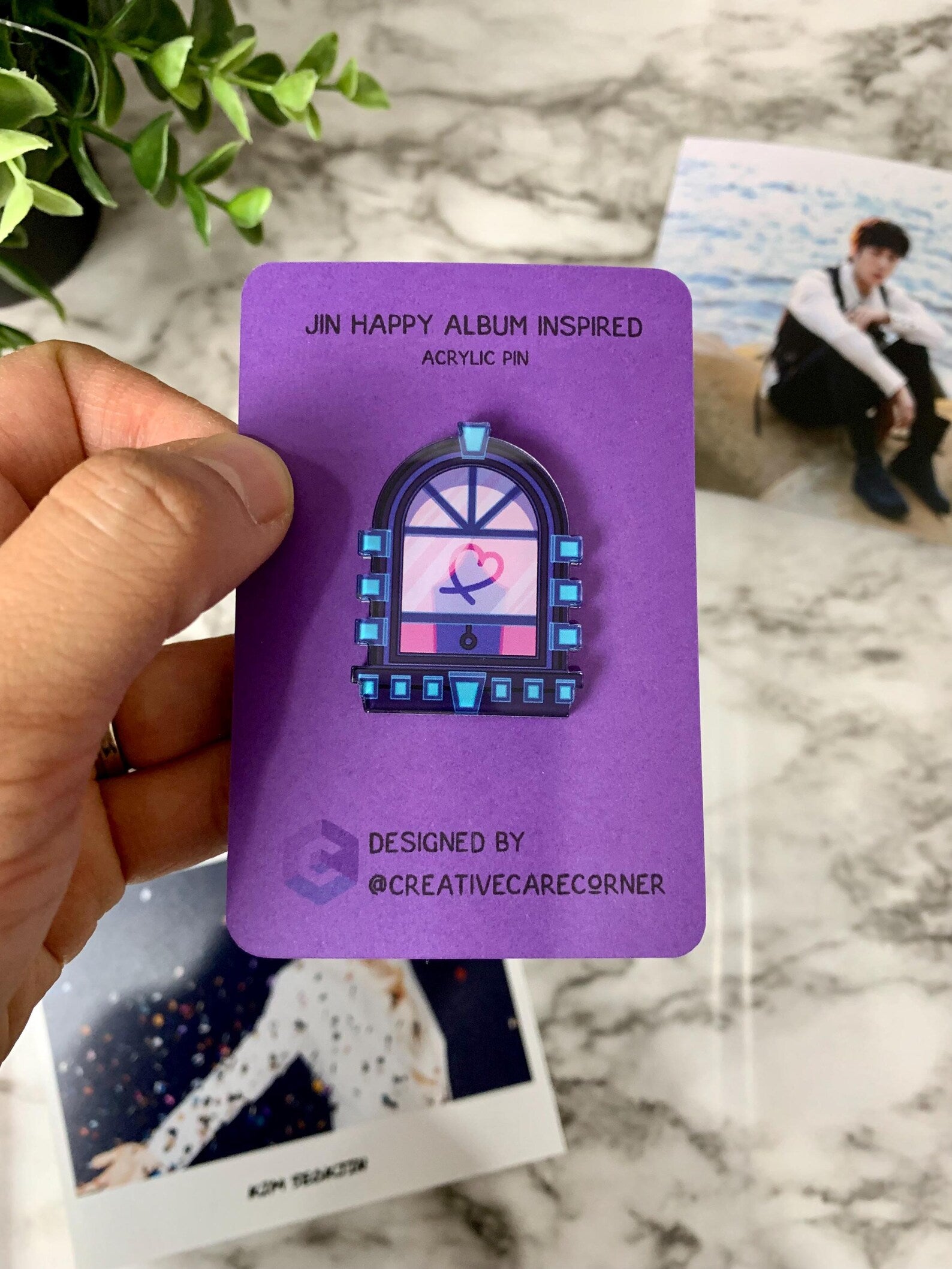 These Heart on the Window inspired acrylic pins are perfect to express your love for the Happy album on your bag, lanyard or clothing! Pins feature an original imagination of a heart on the window.