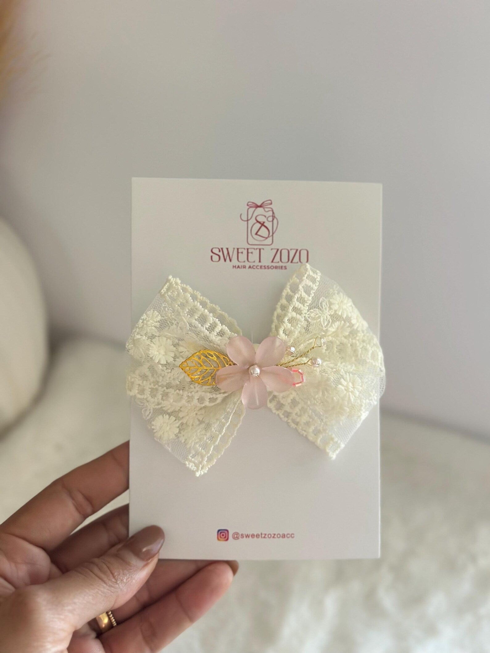 An elegant lace bow clip with pearls and flower details, perfect for special occasions or to dress up a casual look!