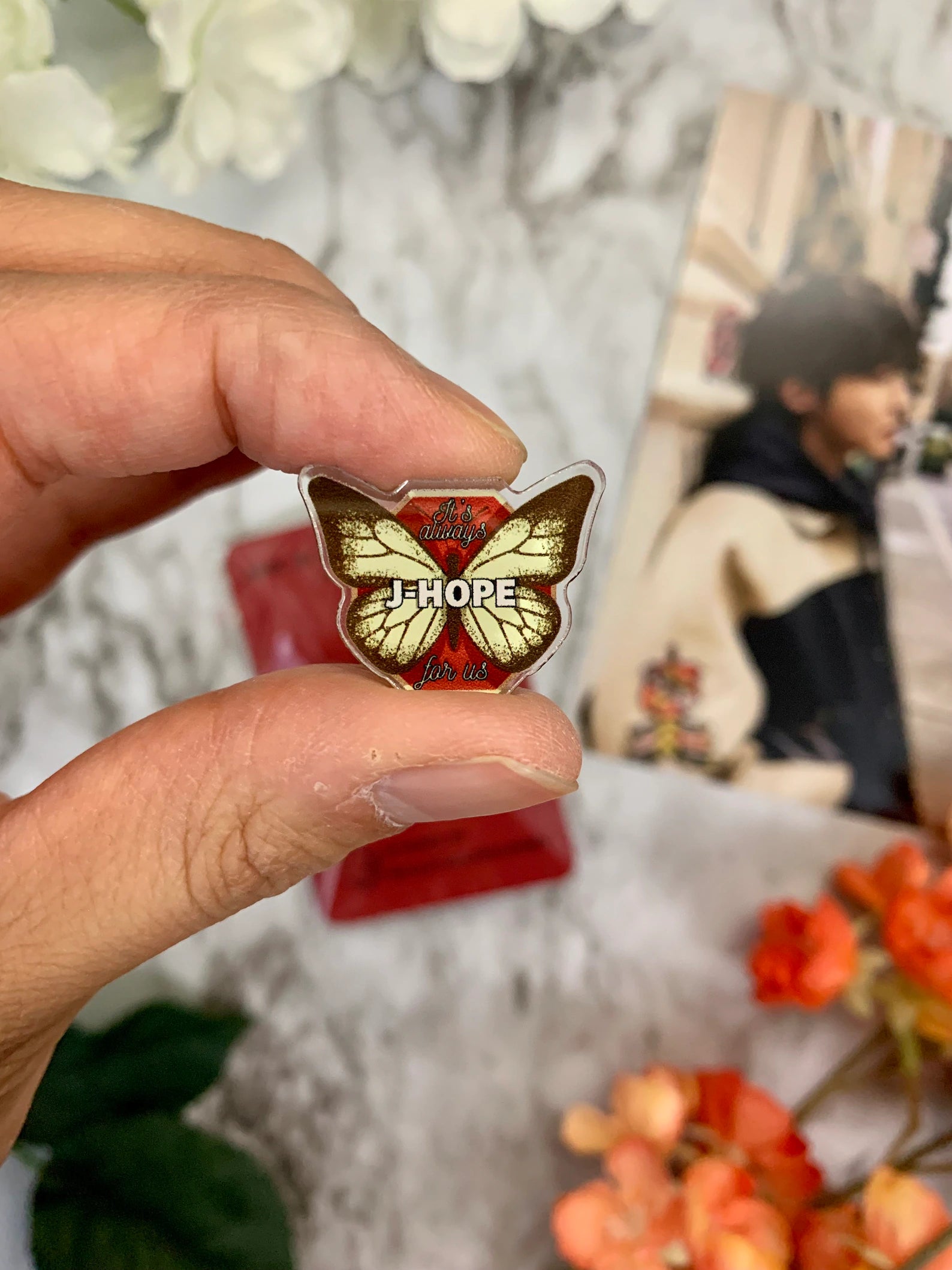 These 'On The Street' inspired acrylic pins are perfect to express your love for this solo song on your bag, lanyard or clothing! Pins feature an inspiring line of the song written on a red stop sign. The butterfly mimics the cover art of the solo song.