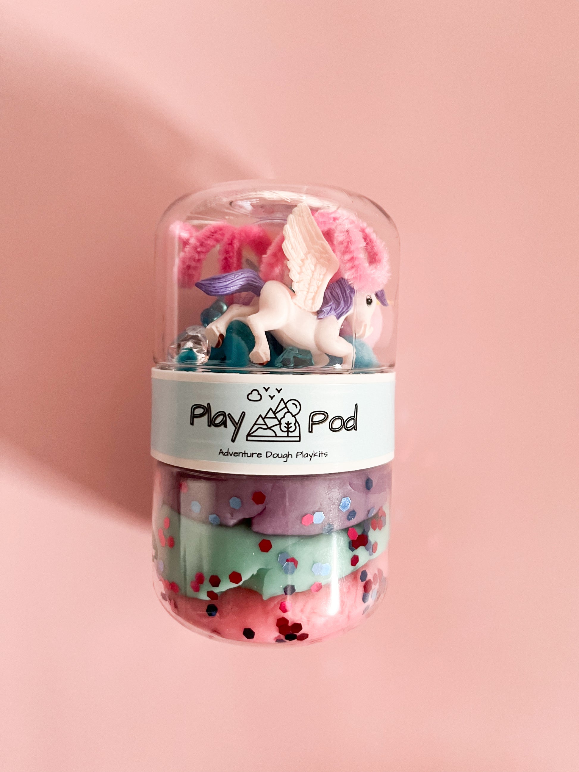 A magical unicorn-themed dough PlayPod for kids to play and exercise their imagination with!