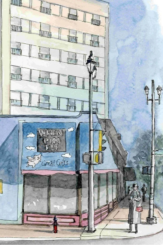 A framed, 5x6 watercolour style print of Edmonton's popular store 'When Pigs Fly' on Whyte Ave.